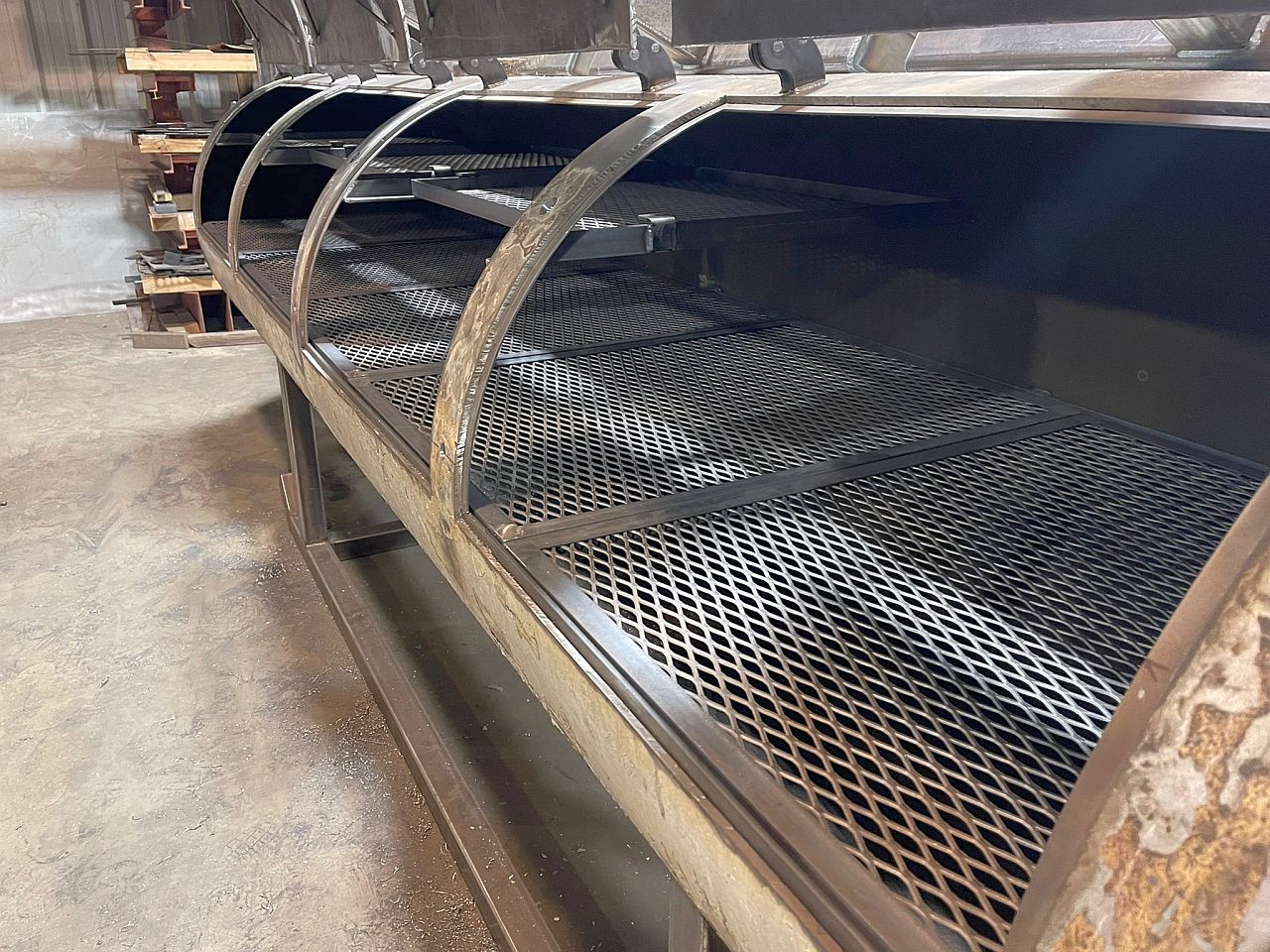 The total cooking surface area is 5.482m² which includes the bottom level racks which run the length of the smoker and consists of five (x5 panels) each measuring 770mm wide x 1000mm deep giving a surface area of is 3.85m² along with the top level racks which consist of three (3x) panels measuring 800mm wide x 680mm deep providing surface area of 1.63m².