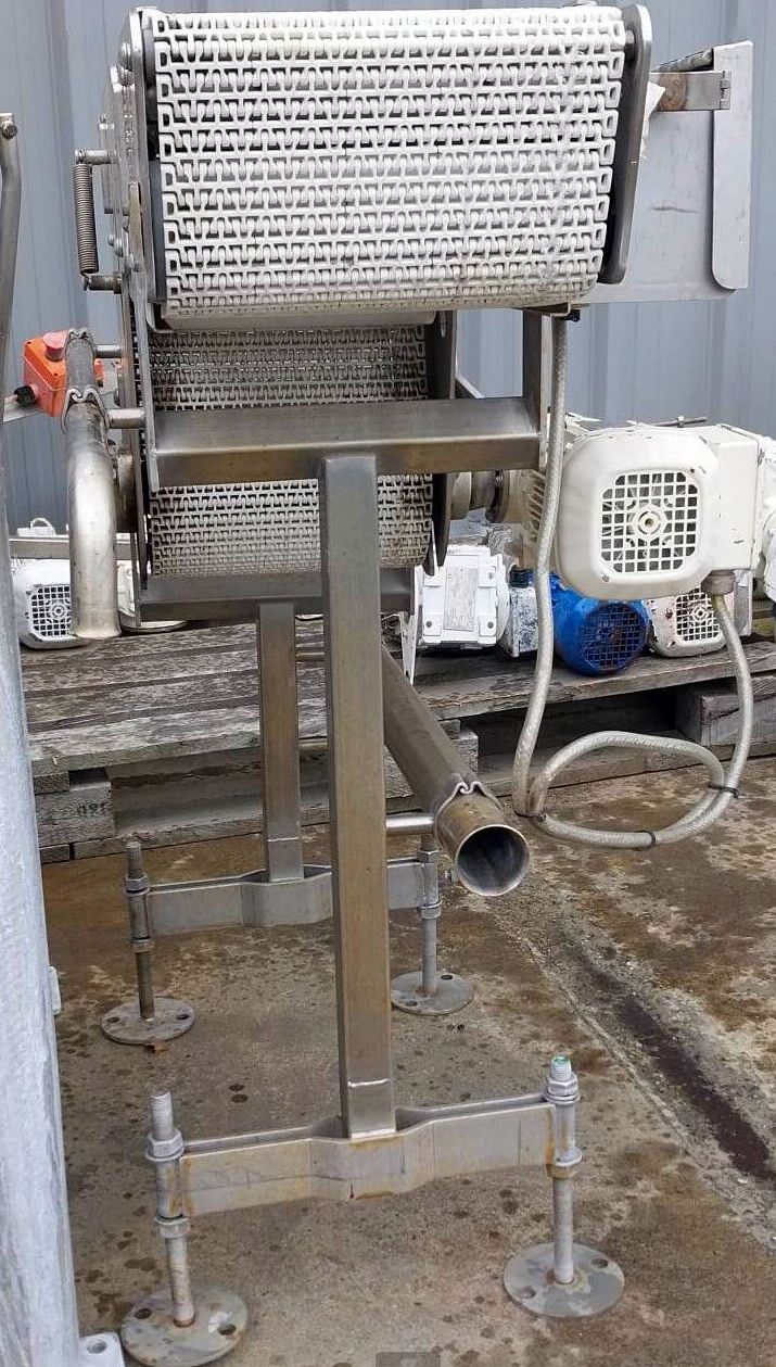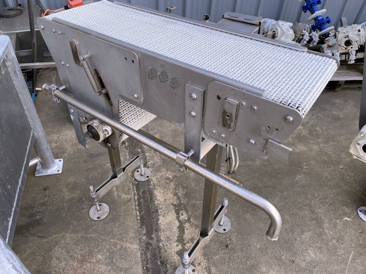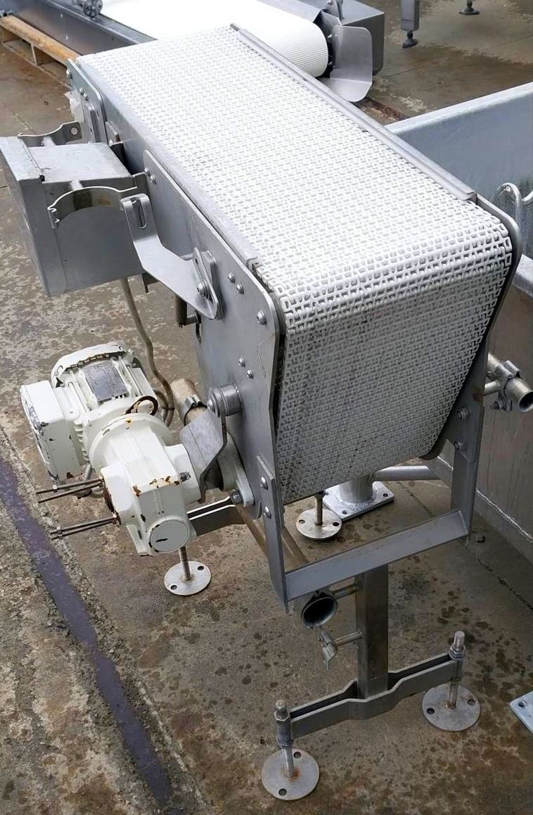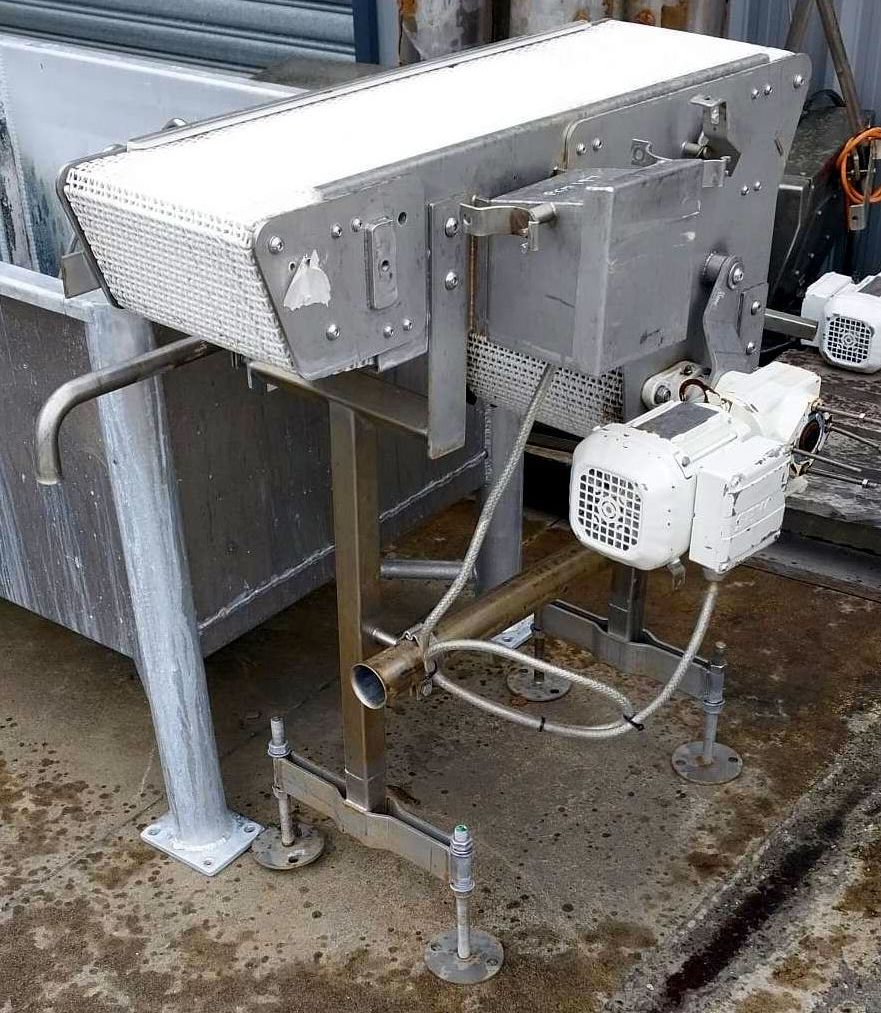 This used / secondhand conveyor has plastic introlox meshed belt and is mounted on height/level adjustable jacking screw feet. The seller has outlined this conveyor: Has 840mm belt length x 250mm belt width.