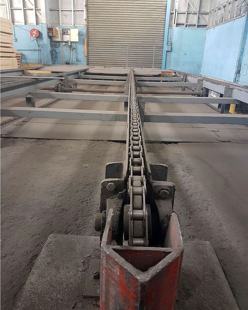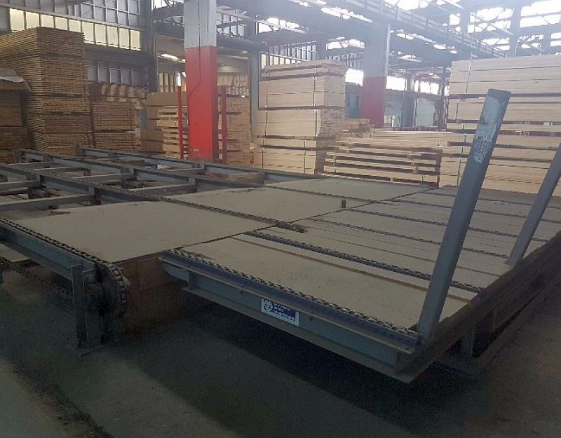There are two of these sawmill infeed conveyor systems for sale. They have an eleven meter long, four strand, chain conveyor and scissor lift.